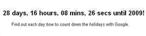 Google yaklaÅŸan yeni yıl için geri sayıma baÅŸladığını bu ay başında duyurdu. özel olarak hazırlanan sayfa saniye saniye 1 Ocak 2009′a yaklaÅŸtığımızı ve 2009′a kaç gün-saat-dakika-saniye kaldığını gösteriyor. her güne özel bir öneri de sunan Google countdown 2009‘a isterseniz mobil cihazınızda isterseniz igoogleda görüntüleyebilirsiniz. iÅŸte makalenin yazıldığı andaki ekran görüntüsü: