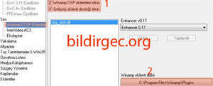 BS Player’ı açtıktan sonra saÄŸ tuÅŸ yapıp sırasıyla Seçenekler>Tercihler>Ses>Winamp 2 DSP Eklentileri yolunu takip edin. Açılan pencerede yukarı da görüldüğü üzere Winamp eklenti dizini yazan yere tıklayarak eklentinin kurulu olduÄŸu yeri seçin. Ekran görüntüsünde 1 ile gösterilmiÅŸ alandaki seçenekleri iÅŸaretlemeyi unutmayın.