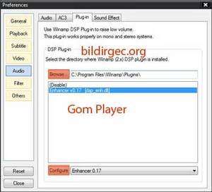 Gom Player’ı açtıktan sonra saÄŸ tuÅŸ yapıp Preferences>Audio>Plugin yolunu takip edin. Yukarıda gördüğünüz ekran görüntüsüne geldiÄŸinizde Browse‘ tıklayarak eklentinin bulunduÄŸu dizini seçin. EÄŸer herhangi bir deÄŸiÅŸiklik yapmadıysanız bu eklentiler kendini C:\Program Files\Winamp\Plugins\ ÅŸeklinde kuracaklardır. EÄŸer yolu doÄŸru seçtiyseniz Enhancer v.017(dsp_enh.dll) gözükecektir. Eklentiyi baÅŸarıyla aktif etmiÅŸ bulunduk. Arzu ederseniz aÅŸağıda açıklayacağım gibi eklentiyi yapılandırabilirsiniz. Gom Player için yapmamız gerekenler bu kadar.